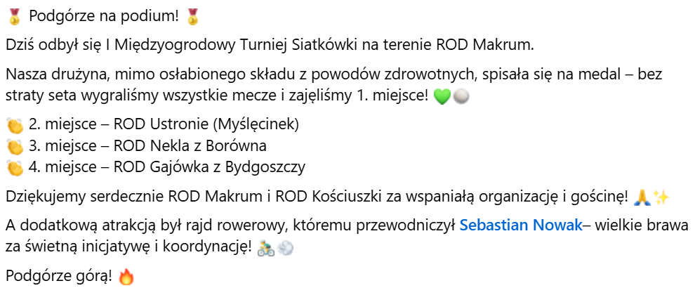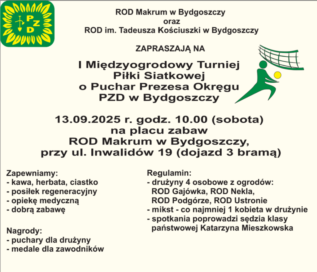 Już w sobotę 13.09.2025 od godziny 10 podgórska drużyna weźmie udział w I Międzyogrodowym Turnieju Piłki Siatkowej o Puchar Prezesa Okręgu PZD.